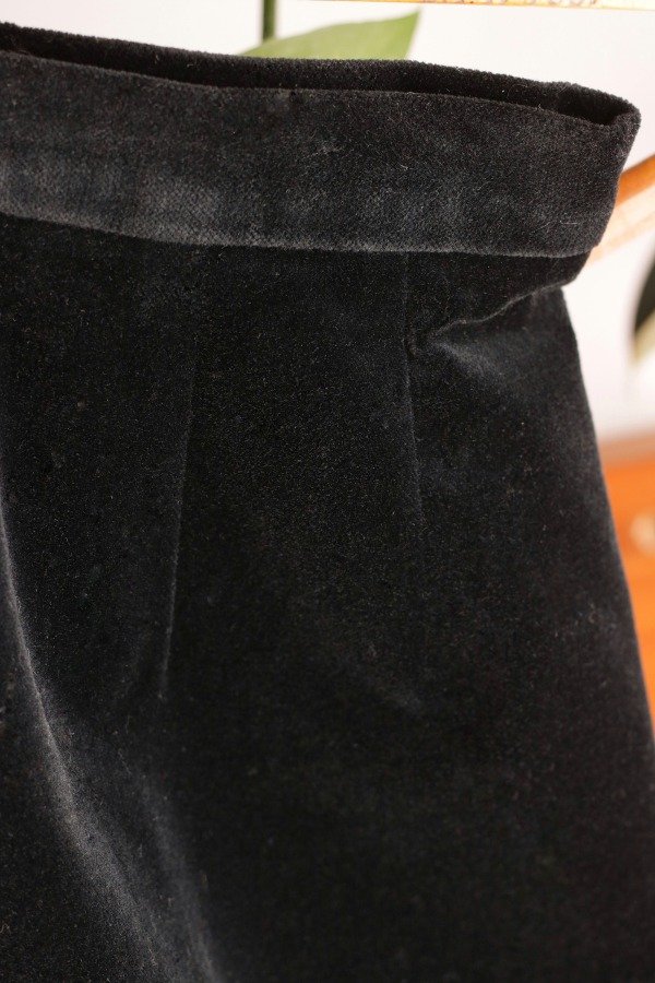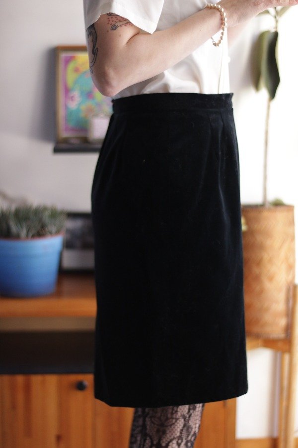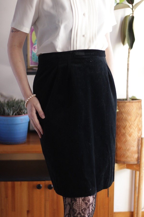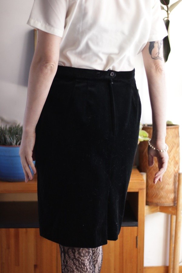 Descripción: Pollera aterciopelada midi negra. Cierra detrás con cierre y botón. Tiene pinzas en la cintura atrás y adelante para un mejor calce. Tajo corto en la parte trasera. Todo el interior está forrado en satén. En perfecto estado. Para tus fantasías de Morticia Addams.