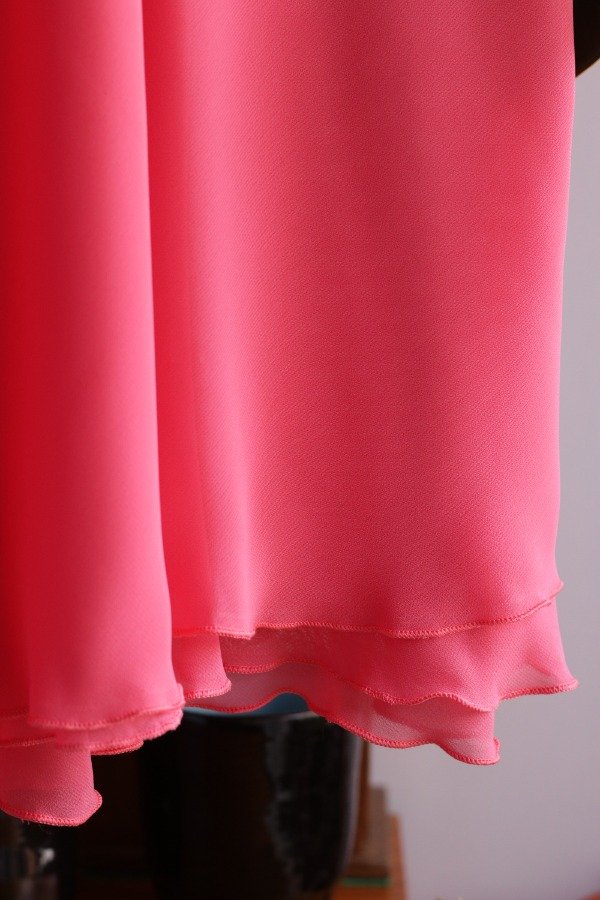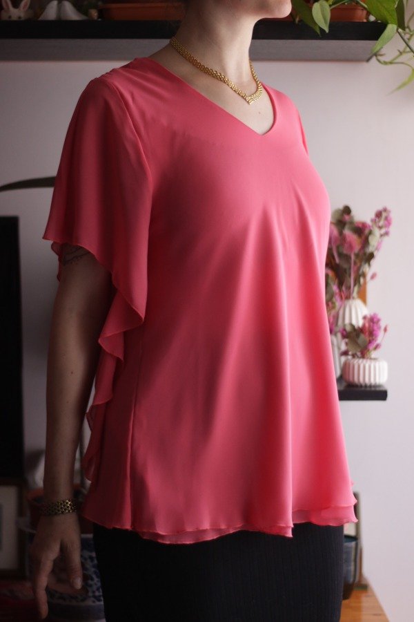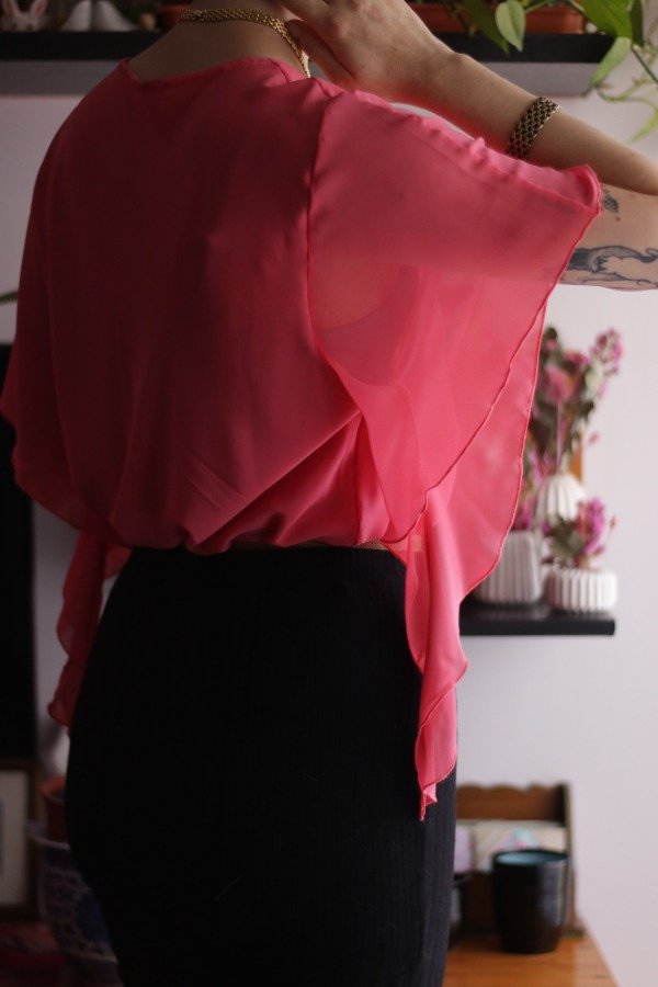 Descripción: Blusa rosada de chifón con mangas con vuelo asimétricas y escote en V. En perfecto estado.