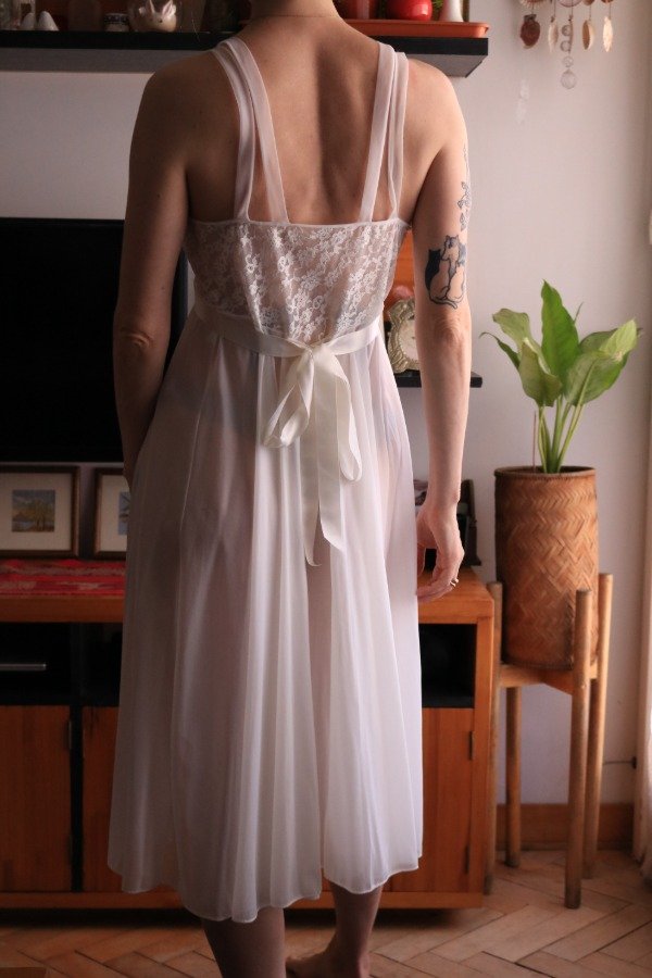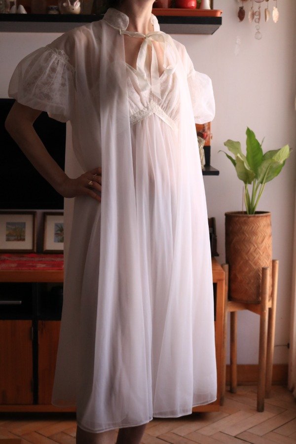 Descripción: Set vintage muy Hollywood en sus épocas doradas. Lleno de detalles delicados. La bata tiene unas micromanchas al frente (ver foto).
